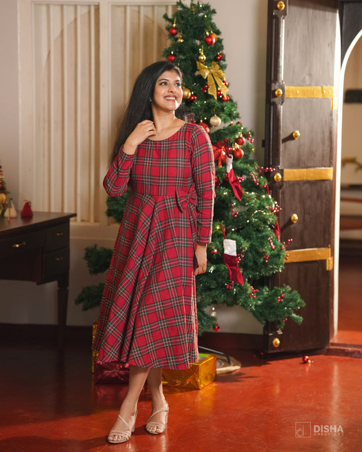 Celebrate the magic of Christmas in timeless style with our Crimson Noel Dress from Disha Creationz. Crafted in rich red and green tartan checks, this elegant A-line dress brings together festive charm and effortless comfort. The soft cotton blend fabric drapes beautifully, while the gentle gathers at the waist and bow detail add a graceful feminine touch.