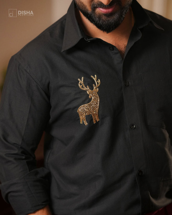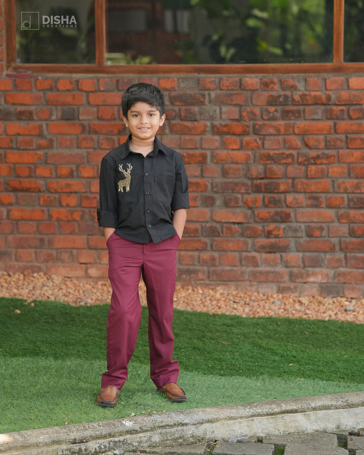 The men’s and boys’ outfits feature a sleek black shirt adorned with a reindeer motif and maroon trousers, while the women’s and girls’ ensembles shine in flowing maroon dresses designed for both comfort and grace. Perfect for Christmas celebrations, family gatherings, and festive photoshoots, this combo radiates love, joy, and coordinated elegance.
