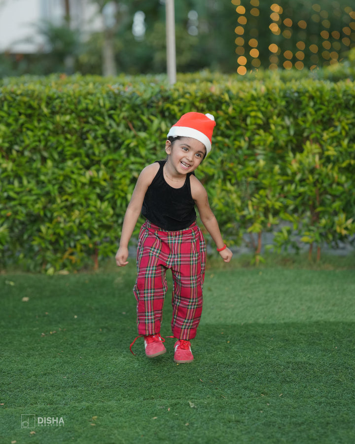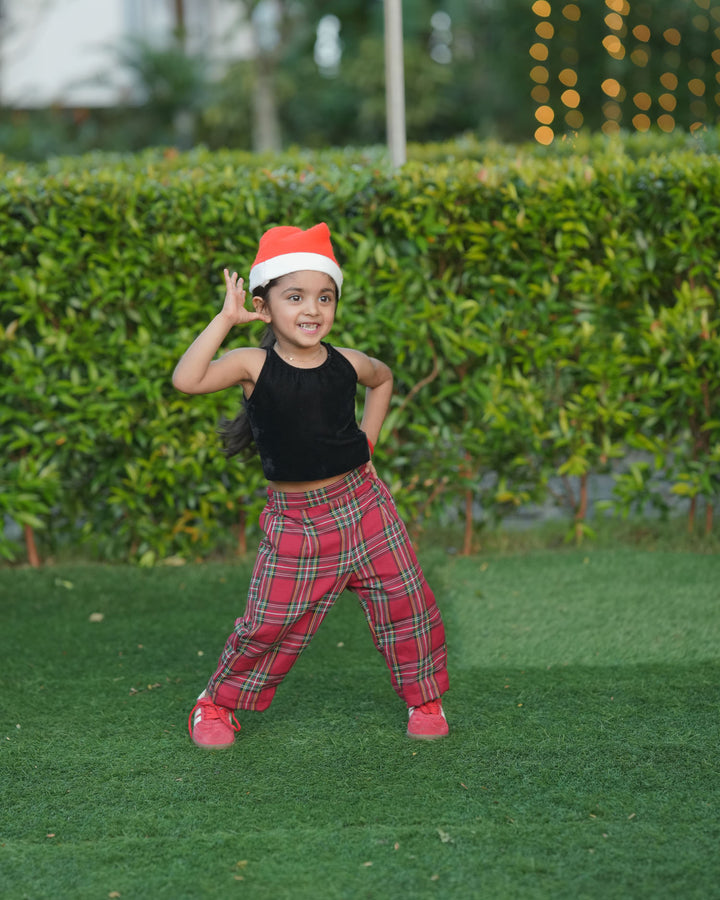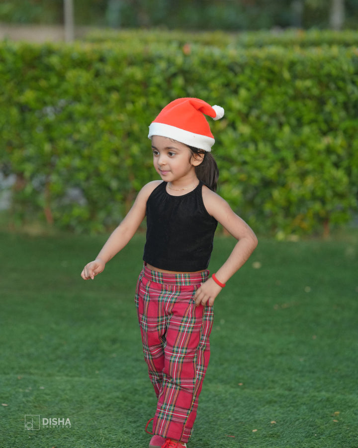 Christmas outfit for kids, red check pants for kids, festive kidswear India, velvet Christmas dress for girls, holiday photoshoot outfit, matching Christmas family combo, Disha Creationz kidswear.