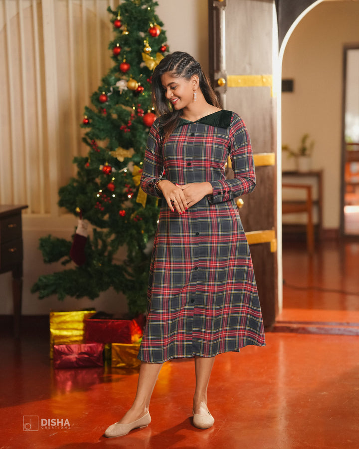 Christmas dress for women India, red and navy check dress, festive midi dress, tartan Christmas outfit, Disha Creationz Christmas collection, women’s holiday dress online, matching family Christmas outfits.
